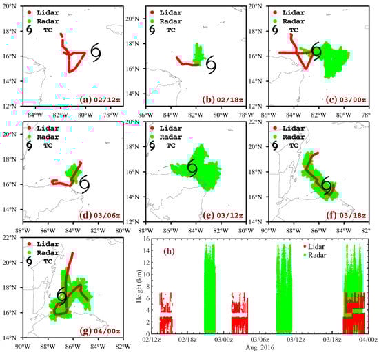 The (a–g) horizontal and (h) vertical distributions of DWL and TDR data for Hurricane Earl at (a) 12 UTC 2, (b) 18 UTC 2, (c) 00 UTC 3, (d) 06 UTC 3, (e) 12 UTC 3, (f) 18 UTC 3, and (g) 00 UTC 4 August 2016.