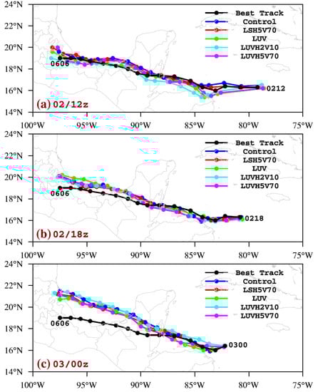 Figure 2 shows the forecast track from the DWL wind speed and wind component assimilation experiments at 12 UTC 2 (Figure 2a), 18 UTC 2 (Figure 2b), and 00 UTC 3 August 2016 (Figure 2c). Table 2 shows the mean 36 h forecast errors from the experiments. With different data thinning strategies in the assimilation of u and v components of DWL data, LUV, LUVH2V10, and LUVH5V70 (see details about the names of experiments in Table 1) resulting in a track forecast with a significant departure from the best track, with mean 36 h track errors of 76.0 km for LUV, 81.1 km for LUVH2V10, and 72.4 km for LUVH5V70. In contrast, the Control has a 36 h track error of 45.1 km. LSH5V70 produces a slightly better track forecast with a 36 h track error of 40.6 km. The poor TC track from LUV, LUVH2V10, and LUVH5V70 indicate poor storm simulation with DWL wind component assimilation.