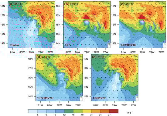 The 850 hPa wind analysis after data assimilation from (a) Control, (b) LUV, (c) LUVH2V10, (d) LUVH5V70, and (e) LSH5V70 for Hurricane Earl during landfall at 12 UTC 2 August 2016. Black arrows denote wind vectors (unit m·s−1).