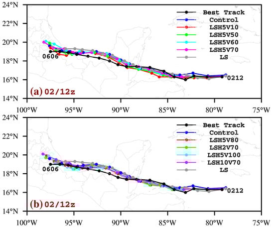 Comparison of the forecast track for Hurricane Earl for different DWL wind speed (a) vertical thinning and (b) horizontal and vertical thinning experiments against Control and best track at 12 UTC 2 August 2016.