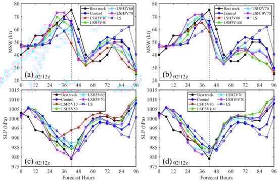 For the hurricane SLP and MSW forecasts, Figure 6 shows the different data thinning experiments and Control against the best track at 12 UTC 2 August 2016. Compared to Control, all the DWL data thinning experiments show improved SLP and MSW forecasts, with a 36 h error reduction of 0.5–3.6 hPa and 0.3–3.0 kt. Meanwhile, compared to other data thinning experiments, LSH5V70 generates an MSW maximum of 73 kt and an SLP minimum of 980 hPa, which is close to the best-track record. Horizontal thinning of 5 km and vertical thinning of 70 hPa in DWL wind speed assimilation can reduce track and intensity forecast errors and provide the best maximum hurricane intensity simulation, which is important for a hurricane forecast. Therefore, this set of data thinning is used to assimilate DWL wind speed in the following combined data assimilation experiments.