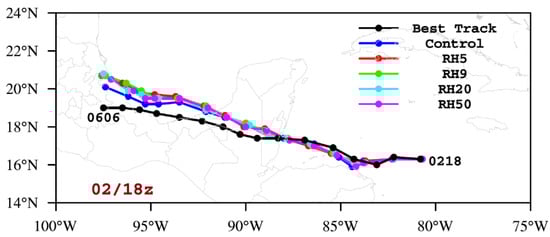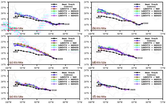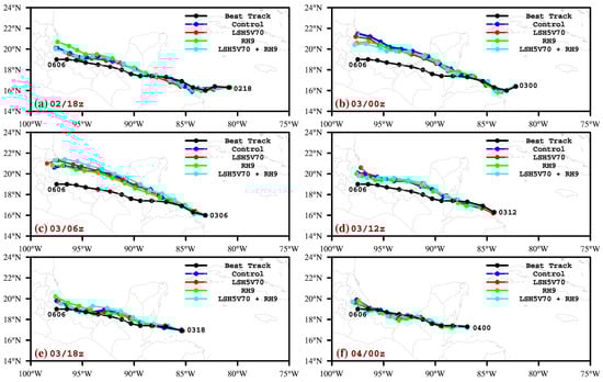 Comparison of the forecast track for Hurricane Earl from Control, LSH5V70, RH9, and LSH5V70 + RH9 at (a) 18 UTC 2, (b) 00 UTC 3, (c) 06 UTC 3, (d) 12 UTC 3, (e) 18 UTC 3, and (f) 00 UTC 4 August 2016.