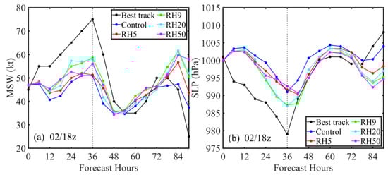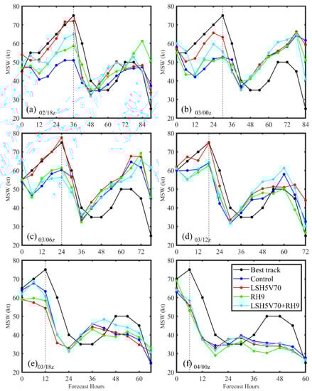 Figure 9 shows forecast tracks of Hurricane Earl from Control, LSH5V70, RH9, and LSH5V70 + RH9 at 18 UTC 2 (Figure 9a), 00 UTC 3 (Figure 9b), 06 UTC 3 (Figure 9c), 12 UTC 3 (Figure 9d), 18 UTC 3 (Figure 9e), and 00 UTC 4 August 2016 (Figure 9f). Table 5 shows the mean 36 h forecast errors from these experiments. The simulated storm in all experiments moves straight toward land. All experiments with data assimilation provide better track forecasts against the Control with reduced track errors (Table 5). TDR data assimilation shows a larger positive impact on the track forecast compared to DWL assimilation; thus, the combined assimilation of TDR and DWL also leads to great improvement in the track forecast. However, the corresponding MSW forecast from these experiments, shown in Figure 10, indicates that RH9 underestimates the MSW of Hurricane Earl at certain times, especially at 06–12 UTC 3 August. LSH5V70 provides the best MSW forecast that always captures the MSW maximum, with a mean 36 h MSW error of −4.2 kt against −9.1 kt from Control. Due to the lack of DWL data at 12 UTC 3, the continuous assimilation gap makes LSH5V70 produce a slightly poor MSW at 18 UTC 03. LSH5V70 + RH9 usually provides a better MSW forecast compared to Control, with a mean 36 h MSW error of −7.1 kt. At 06–12 UTC 3 August, the negative impact from the TDR radial wind caused LSH5V70 + RH9 to produce a poor MSW forecast compared to Control.