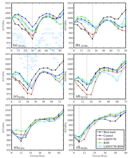 Figure 11 shows the SLP forecast from these experiments. Similar to the MSW forecast, LSH5V70 provides the best SLP forecast and often captures the SLP minimum of Hurricane Earl, with a mean 36 h error of −1.1 hPa against −3.3 hPa from Control. Further, due to the DWL data gap at 12 UTC 3, the SLP forecast is slightly poor at 18 UTC 3 for LSH5V70. For TDR radial wind assimilation, RH9 overestimates SLP at 00–12 UTC 3 August, thus causing LSH5V70 + RH9 to produce a poor SLP forecast. These results indicate that DWL wind speed data assimilation can usually provide the best hurricane intensity forecast, while TDR data assimilation can correct some of the negative impacts of DWL data and create a better hurricane simulation, as shown in Figure 10e,f and Figure 11e,f. However, RH9 often negatively impacts the forecast and worsens the combined data assimilation. Therefore, factors other than the data thinning method (e.g., data quality control) should be modified for TDR radial data in the combined data assimilation.