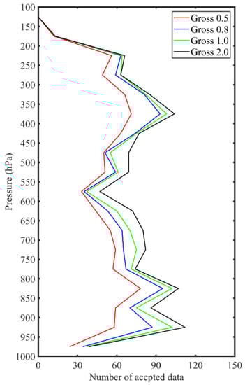 Number of accepted TDR data at different heights with different gross errors at 18 UTC 2 August 2016.