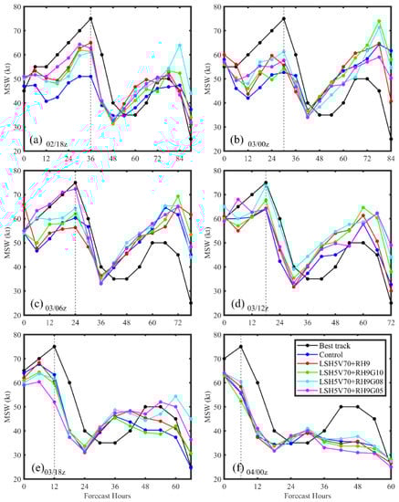 Comparison of the forecast MSW for Hurricane Earl from Control, LSH5V70 + RH9, LSH5V70 + RH9G10, LSH5V70 + RH9G08, and LSH5V70 + RH9G05 at (a) 18 UTC 2, (b) 00 UTC 3, (c) 06 UTC 3, (d) 12 UTC 3, (e) 18 UTC 3, and (f) 00 UTC 4 August 2016.