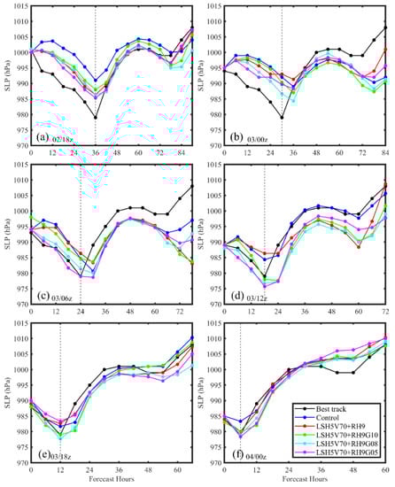 Comparison of the forecast SLP for Hurricane Earl from Control, LSH5V70 + RH9, LSH5V70 + RH9G10, LSH5V70 + RH9G08, and LSH5V70 + RH9G05 at (a) 18 UTC 2, (b) 00 UTC 3, (c) 06 UTC 3, (d) 12 UTC 3, (e) 18 UTC 3, and (f) 00 UTC 4 August 2016.