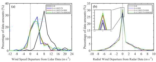 The distribution of O-B (observation minus background) and O-A (observation minus analysis) against (a) DWL wind speeds and (b) TDR radial winds for experiments LSH5V70, RH9, LSH5V70 + RH9, and LSH5V70 + RH9G08 at 18 UTC 2 August 2016. The details of the black box in (b) have been enlarged.