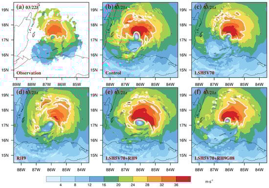 The 1500 m wind from (a) NOAA Doppler radar, (b) Control, (c) LSH5V70, (d) RH9, (e) LSH5V70 + RH9, and (f) LSH5V70 + RH9G08 for Hurricane Earl during landfall at 21 UTC 3 August 2016. The white contour line represents winds over 28 m·s−1 for observations and simulations.