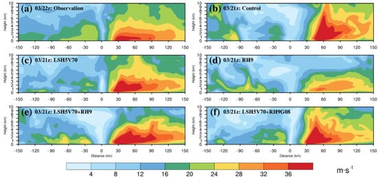 Wind field of a vertical cross-section of Earl at 2100 UTC 3 August 2016 from (a) NOAA Doppler radar, (b) Control, (c) LSH5V70, (d) RH9, (e) LSH5V70 + RH9, and (f) LSH5V70 + RH9G08.
