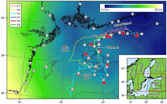 Six marine survey campaigns were conducted in the Eastern Baltic Sea in the spring and summer of 2021 (Table 1 and Figure 2). Each campaign had a primary objective related to different Tallinn University of Technology marine condition monitoring projects. For instance, some tasks involved collecting water samples (e.g., chlorophyll, turbidity, nutrients, phytoplankton), measuring the vertical profiles of water properties (e.g., temperature, salinity, oxygen, light attenuation), or servicing marine monitoring stations. Concurrently, ellipsoidal heights were measured autonomously by four vessel-installed GNSS devices (the used instrumentation is described in [23]). The multi-frequency GNSS receivers were turned on before the vessel left the harbor, and the stored data were downloaded upon returning. During the campaigns, no dedicated GNSS operator was on-board. The GNSS sampling rates were 15 s for the first C1 campaign and 30 s for subsequent campaigns.