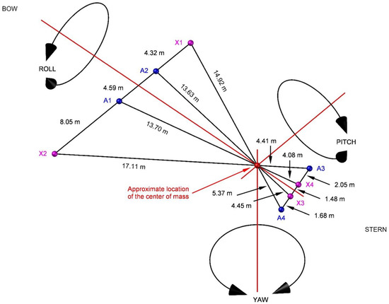 Pitch, roll, and yaw motions of a moving vessel and relative locations of the used GNSS antennas (colored blue). The red lines are the principal axes of the vessel, whereas the black lines denote total station measurement derived distances between antennas and imaginary (magenta colored) intersection points. All points are shown in horizontal projection (i.e., as reduced to the sea surface).