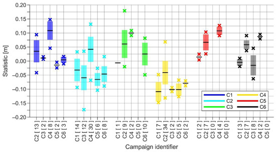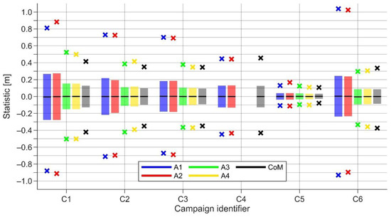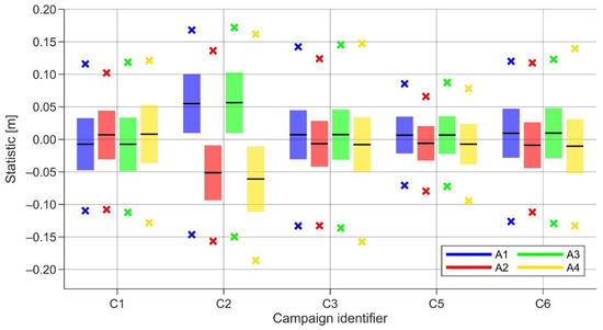 To further analyze the performance of conducted computations, the unfiltered and filtered residuals were compared (i.e., filtered results were subtracted from unfiltered). The statistics of their differences are summarized in Figure 12. The most significant differences were consistently detected for antennas A1 and A2, again suggesting dominating pitch motion at the vessel’s bow. A reduced standard deviation was always (except for the C4 campaign, which showed no improvement) produced for the mass center solution. In contrast, the low-pass filter eliminated more noise from individual antenna solutions (i.e., resulting in greater differences between unfiltered and filtered residuals). It, hence, appears that the vessel’s high-frequency attitude changes were indeed eliminated (or at the very least significantly reduced) in the (cf. Section 5.1).