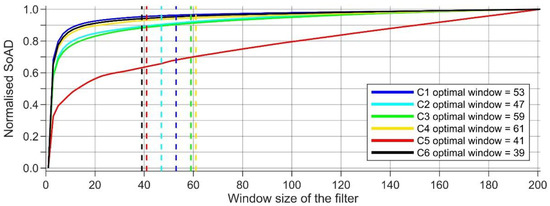 Sum of absolute difference (SoAD) functions for the marine survey campaigns. Optimal filtering window sizes are shown with dashed vertical lines.