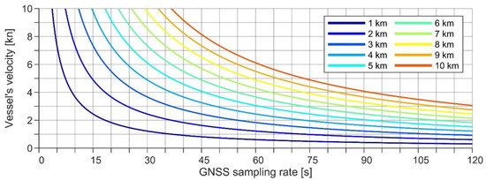Filtering window length dependency on GNSS sampling rate and vessel velocity, by assuming an optimal filtering window size of 53 measurements.
