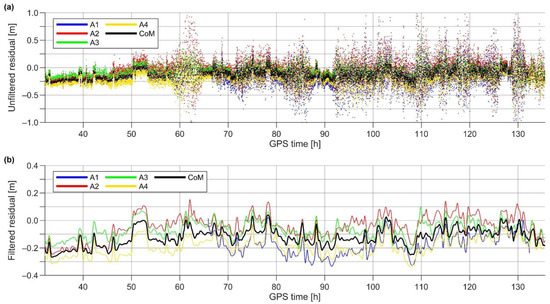Residuals of the C2 campaign for antennas A1–A4 and the mass center solution (denoted CoM), (a) before and (b) after low-pass filtering.