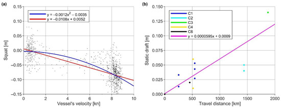 Ideally, squat information should be provided by a vessel-specific squat table. Such a table was not available for this study. Thus, the squat correction was estimated empirically as a direct data derivative (cf. Section 5.3). Since the squat is approximately a quadratic velocity function, a quadratic function was fitted to the empirical data in the least-squares sense. As an alternative, a least-squares fit of a linear function was also used to approximate squat correction (cf. Figure 13a). The resulting residuals from using these two functions are compared in Figure 21. Note that the offset term was not considered for the linear function, as was the case with the quadratic function (cf. Equation (21)).