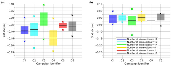 where denotes discrepancies at the location of the initially excluded fourth antenna. Statistics of discrepancies are summarized in Figure 8, indicating the expected GNSS height determination accuracy. It can be noticed that, generally, the discrepancy mean values are sub-centimeter, suggesting the successful reduction of ellipsoidal heights to the sea surface using Equation (8) (i.e., all four antennas are approximately on the same plane). Note that the weighted mean (according to campaign distances presented in Table 1) standard deviation estimate (by averaging the values shown in Figure 8) of 4.1 cm showed a good performance for height determination.
