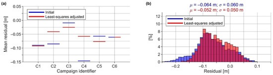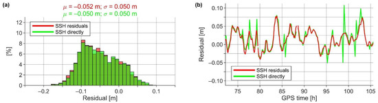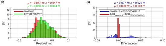 For the next experiment, the NKG2015 geoid model was exchanged for the EST-GEOID2017 during data processing. The resulting discrepancies are compared in Figure 20a. Note that the red histogram differs from those in Figure 16b, Figure 18a, and Figure 19a, since the comparison was conducted over a reduced area (EST-GEOID2017 does not extend southward from 57° N). The comparison in Figure 20a demonstrates the slightly better performance of the EST-GEOID2017 model, which is consistent with previous studies’ results.