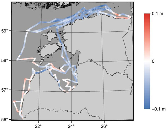 The collected shipborne GNSS data were post-processed relative to the Estonian [34] and Latvian [35] national GNSS continuously operating reference stations (CORS) with the commercial Trimble Business Centre software (version 5.52; Trimble Inc., Sunnyvale, CA, USA). Precise GNSS ephemerides (final orbits) from the International GNSS Service were incorporated into post-processing. Since Trimble Business Centre allows only one base station at a time for kinematic data post-processing, the closest GNSS-CORS (cf. Figure 2) was always employed for a GNSS data point computation (similarly to [11,24]). The GNSS-CORS coordinates were fixed to the reference epochs of the national reference frames (i.e., the standard data processing scheme was used). However, the Baltic Sea region’s geodetic networks are deforming, primarily due to glacial isostatic adjustment induced vertical land motion (VLM). The VLM generates discrepancies between the reference and observation epoch positions of a GNSS-CORS, consequently introducing an offset to the marine GNSS measurements (cf. Figure 1), since sea level trends do not follow the VLM directly (but do contain the glacial isostatic adjustment induced geoid change). The neglected VLM correction may, thus, yield lower than actual SSH in the land uplift regions. By employing the principles outlined in [26], the GNSS measurements were corrected retrospectively for VLM occurring at the GNSS-CORS: