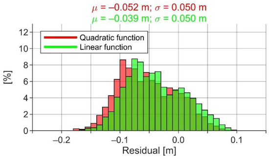 Although the use of the quadratic function is, in theory, more correct, the results in Figure 21 indicate a better performance for the linear function, as the residuals are significantly less biased toward negative. It, thus, appears that the quadratic function underestimates the squat correction. The result also implies that a portion of the 5.2 cm bias in the data originates from inaccurate squat correction.