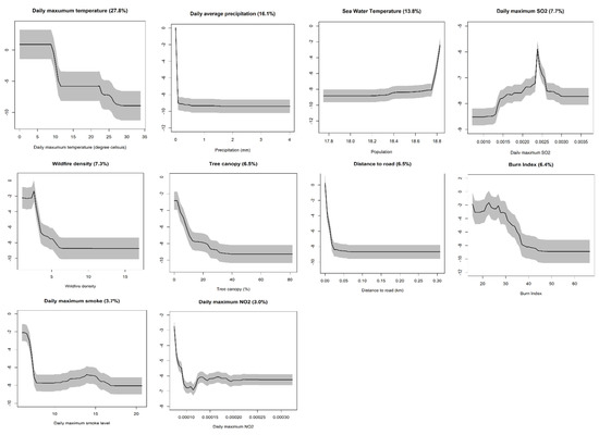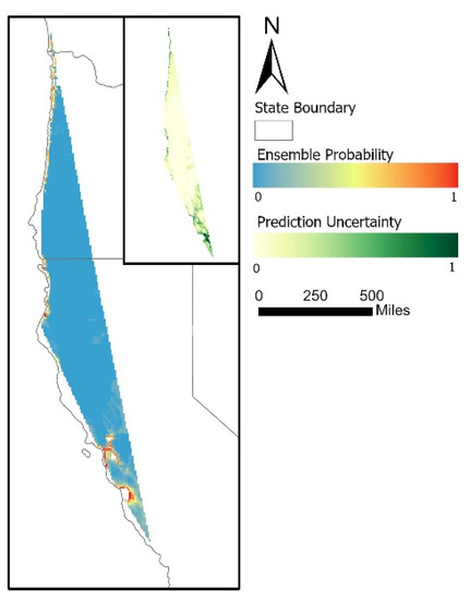 | Common Murre | Maximum temperature + Tree canopy + Precipitation + Burn index + Ocean temperature + Distance to roads + Wildfire density + Maximum smoke + SO2 + NO2 | 0.98 (0.97, 0.99) | 0.98 (0.97, 0.99) |