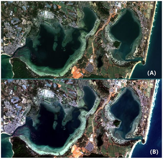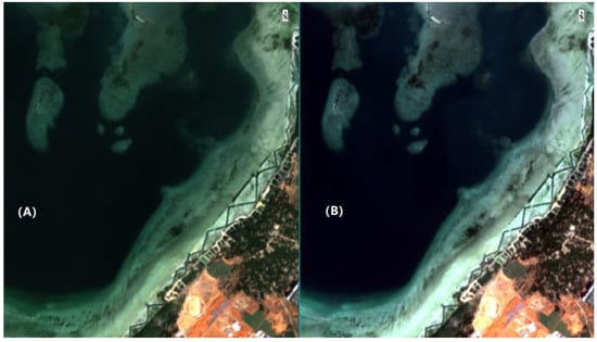 - Sagawa, T.; Boisnier, E.; Komatsu, T.; Mustapha, K.B.; Hattour, A.; Kosaka, N.; Miyazaki, S. Using bottom surface reflectance to map coastal marine areas: A new application method for Lyzenga’s model. Int. J. Remote Sens. 2010, 31, 3051–3064. [Google Scholar] [CrossRef]