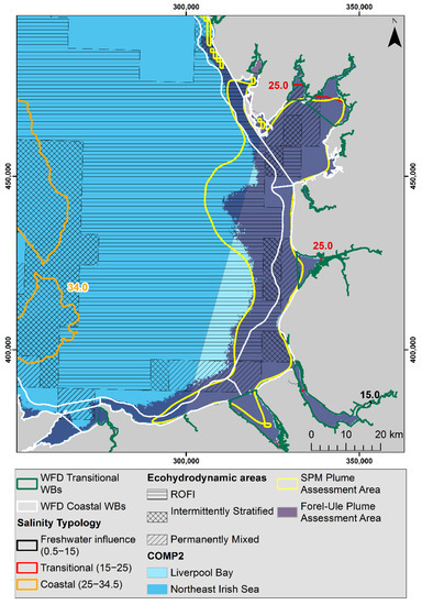 - Polton, J.A.; Palmer, M.R.; Howarth, M.J. Physical and Dynamical Oceanography of Liverpool Bay. Ocean Dyn. 2011, 61, 1421. [Google Scholar] [CrossRef]