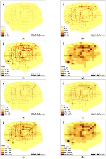 In summary, compared with the temporal scale, the spatial scale has a greater impact on the analysis of geographical phenomena. The larger the temporal unit selected for data analysis, the more data are included, whereas the smaller the temporal unit is, the less data are included. Even if the data volume increases, the data distribution in the study area does not considerably change; that is, the selection of the temporal scale has little effect on the data analysis. However, different spatial scales have a greater impact on the data distribution and influence the calculation results for geographical phenomena. Therefore, when analyzing geographical phenomena, optimization of the spatial analysis unit should be prioritized.