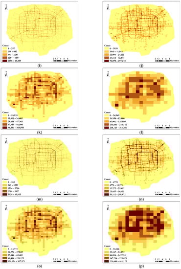 Table 7 shows that the types of hotspot functions at the temporal scale of day and the spatial scales of 1000 m and 2000 m best reflect the actual functions of urban hotspots. At these spatial and temporal scales, catering and entertainment hotspots account for nearly 40% of all hotspots; if office and cultural function types are added, this total increases to more than 70%. Hotspots are usually distributed in densely populated areas. According to the analysis of national demographic data, from the perspective of population distribution, the calculated hotspot areas are consistent with the population distribution pattern of Beijing (the northern part of Beijing’s Fifth Ring Road zone is more populated than the southern part). According to the calculation of the distribution of urban hotspots, it is shown that the spatiotemporal units of day/1000 m and day/2000 m are the optimal spatiotemporal scales, which are consistent with the results calculated by the spatiotemporal analysis unit optimization framework. Therefore, from the distribution of functional types and population distribution in relation to urban hotspots, the accuracy of the optimization framework for spatiotemporal data analysis units is further verified.