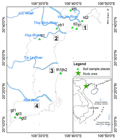 The study area: Hai Phong-Thai Binh coastal area, Vietnam. (1) Van Uc estuary; (2) Thai Binh estuary; (3) Tra Ly estuary; (4) Red River estuary.