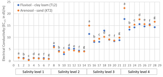 The salinity characteristics of the two soils contaminated with NaCl, Na2SO4, Na2CO3, as mono-salt in mixture, clearly demonstrate the effect of NaCl on the electrical conductivity of each of the 56 soil samples (Figure 3). The four levels of salt amounts added to the soil corresponded to a different electrical conductivity (EC1:5). EC1:5 ranged from 0.35–1.41 dS/m for salinity level 1, 2.90–6.34 dS/m for salinity level 2, 8.04–12.90 dS/m for salinity level 3, and 13.30–22.40 dS/m for salinity level 4 (Figure 3). The EC1:5 of the sand soil sample (KT2-a), to which more than 3.5 g NaCl was added, was higher.