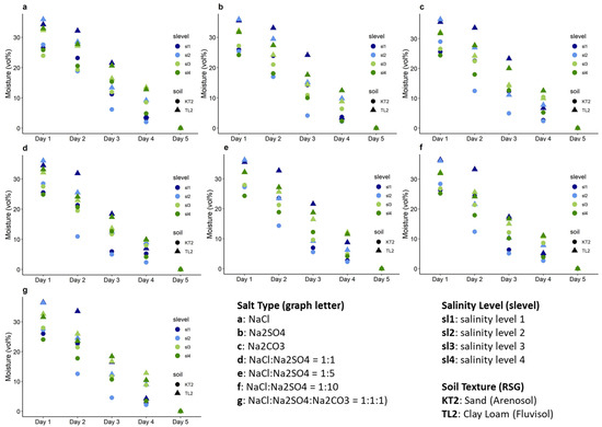Clear differences were observed between the moisture levels at different salt concentration levels for each of the two soils (Figure 4). Two soil types were included (sand, clay loam), the salinity included four levels and the sampling time consisted of five sampling days (Figure 4). All effects were statistically significant at the <.001 level. The main effect yielded an F ratio of F(1, 240) = 1064, p < 0.001 for soil, F(3, 240) = 84, p < 0.001 for salinity level, and F(4, 240) = 4189, p < 0.001 for sampling time, indicating a significant difference between soils, salinity levels and sampling times. All of the interaction effects were significant, ranging from the interaction between the soil, salinity level and sampling time on soil moisture with an F ratio of F(12, 240) = 7.1, p < 0.001 to the interaction of the soil and sampling time on soil moisture with an F ratio of F(4, 240) = 79, p < 0.001. A model incorporating the salt type together with the soil type, salinity level and sampling time, but without considering interaction effects, did not have a significant influence on soil moisture, where F(6, 265) = 0.639, p = 0.699. Though differences were observed between salt types with respect to soil moisture, these were not significant. Overall, the higher the salinity level, irrespective of the salt type, the higher the soil moisture. This effect was more pronounced at lower moisture levels: for sand, the effect occurred from the second sampling day onwards and for clay loam, from the third sampling day onwards.