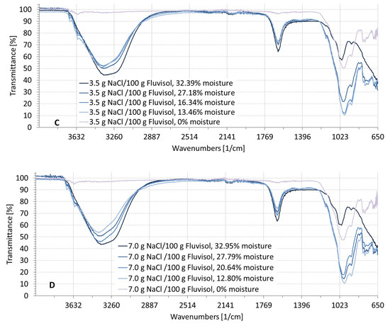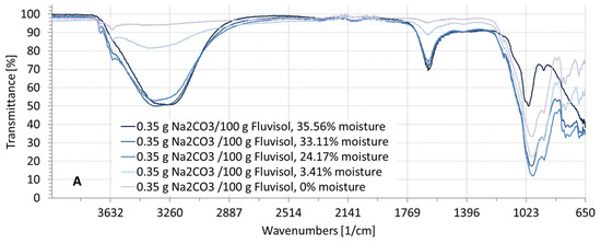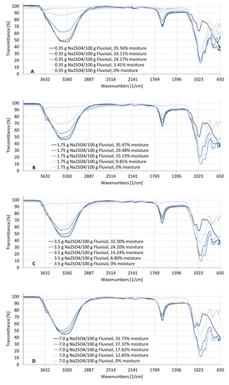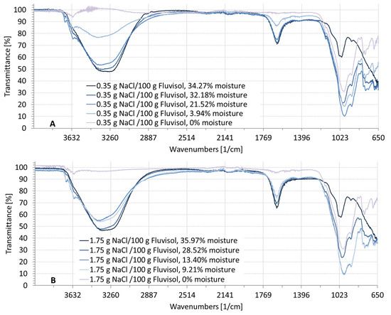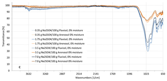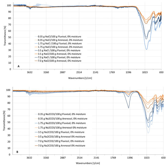 The transmittance was fluctuating in the wavenumber ranges from 3600 to 2900 cm−1 (2.78–3.45 µm) and strongly fluctuating from 1700 to 1500 cm−1 (5.88–6.67 µm), due to the influence of moisture in the soil (Figure 6, Figure 7 and Figure 8). The higher the moisture, the deeper the absorbance. These fluctuations did not appear when the soil was dry for a wavelength range from 1200 to 650 cm−1 (8.33–15.38 µm). Figure 6 represents the soil spectral signature at different moisture levels and contaminated with Na2CO3. Three absorbance bands were similar to the spectrum of soil contaminated with NaCl (Figure 5) or Na2SO4 (Figure 8), ranging from 3600 to 2900 cm−1; from 1700 to 1500 cm−1; and from 1200 to 650 cm−1. An additional absorbance peak appeared in the wavelength range from 1500 to 1200 cm−1 (Figure 7). This wavenumber range displayed a deep absorbance depending on the salt concentration, that also appeared when the soil was dry and not affected by soil moisture.