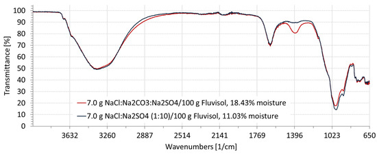 Spectral signatures of mixed salts (Figure 9) were similar to the spectra of single salt-contaminated soils. Soil mixtures with Na2CO3 salt had absorbances from 1240 to 1480 cm−1 and multiple absorbance/transmittances at different wavelengths depending on the moisture and salt content. An additional absorbance occurred between 1364 and 1430 cm−1 (Figure 9).