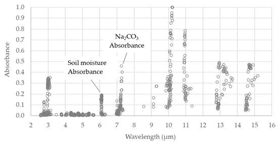 The spectra of the soil samples contaminated with Na2CO3 at different concentrations, combined with different moisture levels from saturated to dry, showed that the spectral absorbance depended on both the salt and moisture contents of the soil. Almost all of the absorbances were concentrated at specific wavenumbers. Absorbance peaks related to changes in soil moisture occurred at wavenumbers 1000 cm−1 (10 µm) and 1630 cm−1 (6.13 µm) (Figure 10). Absorbance peaks related to the occurrence and changes in Na2CO3 content were concentrated in the wavenumber range from 1370 to 1420 cm−1 (7.0–7.3 µm) (Figure 10).