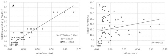 The relationship between the absorbance peaks and the change in salt content occurred between wavelengths 6.9 and 7.4 µm, with a peak at 6.99 µm. Between the Na2CO3 contaminated soil and the spectral absorbance value was a linear relationship (Figure 11A) with R2 > 0.5 between wavelengths 6.9 and 7.4 µm and a maximum of R2 = 0.85 at 6.99 µm. Moreover, at these wavelengths, the relationship between the soil moisture and the spectral absorbance value showed very low correlations, R2 = 0.0406 (Figure 11B). The relationship between the Na2CO3 contaminated soil and spectral absorbance is at wavenumber 1431 cm−1 (wavelength 6.99 µm) and can be used to predict the salt content in the moist soils of delta areas.
