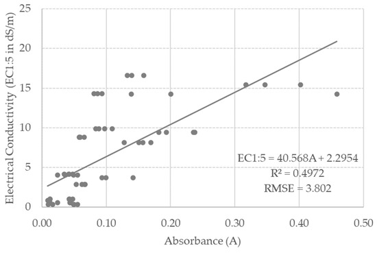 Relationship between electrical conductivity (EC1:5 in dS/m) and spectral absorbance at wavenumber 1430 cm−1 (wavelength 6.99 µm). Only Na2CO3 contaminated soils were included.