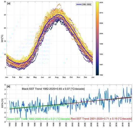 Figure 2a demonstrates the superposition of 39 annual cycles of SST averaged over the entire Black Sea, giving us an indication of the SST variability range for each month/season. This time series shows a strong annual cycle, with lower values (~7 °C) from February to March and the highest values in summer (~25 °C), mainly in July and August. The annual cycle range (i.e., summer maxima–winter minima) is about 17 °C, in agreement with [1,15]. It is worth noting that most of the years with temperatures above the climatic mean (the solid blue line in Figure 2a) occurred after 2010 (the solid yellow lines). Figure 2b shows the monthly SSTA time series and trends over the study period (1982–2020). The highest SSTA values were observed in the last two decades of the study period (i.e., 2001–2020). The lowest anomalies were noticed in 1985 and 1987, which is consistent with [14]. Over the last two decades (2001–2020), a statistically significant (p < 0.05) increase in SST temporal trend of about 0.71 ± 0.19 °C/decade was detected over the entire Black Sea (the solid red line in Figure 2b), whereas this trend value was about 0.40 ± 0.21 °C/decade during the first period (1982–2000, the continuous blue line in Figure 2b). During the entire study period (1982–2020), the average warming rate of the Black Sea SST was about 0.65 ± 0.07 °C/decade (the solid black line in Figure 2b).