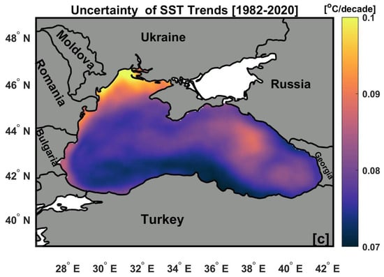 Figure 3a–c depicts the spatial distribution of mean SST in the Black Sea, the SSTA trend, and its uncertainty from 1982 to 2020. The Black Sea is characterized by a minimum mean SST of 12.5 °C (Figure 3a) in the northern shelf area, close to the Dnieper and Dniester rivers estuary (Figure 1), with a warmer area (>16.4 °C) in the eastern part of the basin, possibly due to the warm anomaly caused by the permanent Batumi anticyclone eddy (see [15,34,59]). A statistically significant (p < 0.05) trend was detected across the whole basin (Figure 3b). The average SST warming rate in the basin was about 0.67 ± 0.08 °C/decade. The Caucasus anticyclone eddy off the Russian coast has the highest SST trend (up to 0.75 °C/decade), whereas the lowest value (~0.55 °C/decade) was found off the southeastern Ukrainian coast. In general, the linear SST trend gradually increases from the western to eastern basins of the Black Sea in agreement with [2]. In comparison with the trend values, the spatial pattern of the SST uncertainty trend is small (<0.08) across most of the Black Sea (Figure 3c).