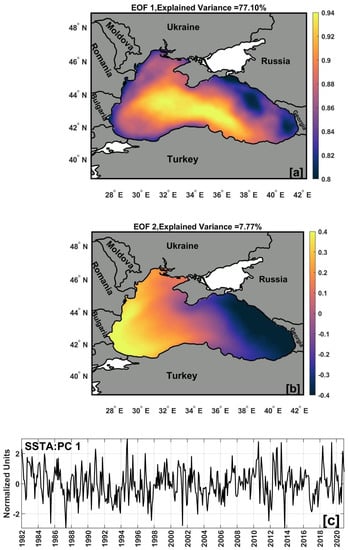 The first two SST EOF modes (Figure 4a,b) accounted for ~85% of the total nonseasonal variance. The pattern of the first EOF1 mode exhibited coherent behavior (i.e., an in-phase oscillation) throughout the entire Black Sea (Figure 4a). The central and western Black Sea had the most variability (Figure 4a), while the Batumi anticyclone eddy zone (Figure 1), the Caucasus anticyclone eddy zone, and south of the Azov Sea entrance had the least variability. This lower variability could be related to the warm anomaly produced by the periodically recurring (quasi-permanent) Batumi and Caucasus anti-cyclonic eddies [15,34,59]. Equivalent PC1 peaks were observed in the summers of 1994, 2010, 2013, 2018, and 2019. The most negative maxima variability occurred in the winters of 1985, 1987, 1997, 2001, 2011, and 2013 (Figure 4c).
