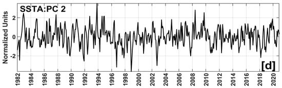 The empirical orthogonal function (EOF) approach [38] was used to assess the dominant spatiotemporal patterns in SST variability (1982–2020). EOF analysis is one of the most extensively used and recognized approaches to understanding the variability in climate data [39,40,41]. EOFs have been extensively examined in the literature, largely oriented toward atmospheric scientific applications [42,43,44]. This method fundamentally captures the nonlinearity and high-dimensional characteristics of a given dataset while preserving the key patterns and their variability, allowing users to derive useful information for data interpretation and analysis [39,40]. Here, we focused on the nonseasonal modes of SST: Before decomposing the EOF, we subtracted the seasonal cycles and trends from the monthly SST means at each grid location; furthermore, the SST was normalized by dividing each grid-point time series by its standard deviation [45]. The substantial seasonal signal was eliminated from the data at each grid-point to produce de-seasoned maps and time series, according to [46,47]. This is done by removing the climatological SST mean for each calendar month from the corresponding months over all years.