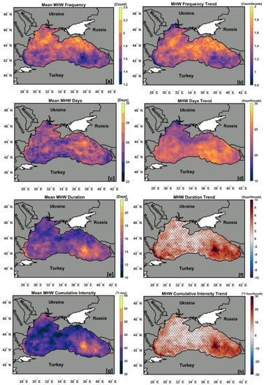The annual mean duration of an MHW (Figure 5e) ranged between 10 and 22 days, with the highest values (>20 days) found in the southeastern Black Sea basin (i.e., the eastern cyclonic gyre region). A significant (p < 0.05) MHW duration trend (>8 days/decade) is recorded only in two locations: off the southeastern Bulgarian coast and in the southeastern Black Sea basin (i.e., the eastern cyclonic gyre). There is an interesting similarity between the MHW duration and the cumulative intensity spatial patterns in terms of significant and nonsignificant regions (Figure 5e,g). Annual mean MHW cumulative intensity values varied from 30 to 60 °C days, with the greatest value of >50 °C days occurring at the same location as the highest MHW duration values. The highest MHW cumulative significant intensity trend values (p < 0.05; >10 °C days/decade) are found in the same locations as the MHW duration trends (Figure 5f,h).