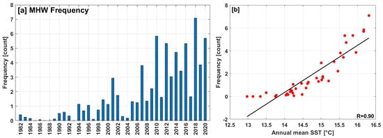 The correlation coefficient between MHW cumulative intensity and annual mean SST (Figure 6f) was 0.60. The years with the maximum total annual MHW days (>100 days) were observed in the last decade: 2012, 2018, and 2020. (Figure 6g), whereas the correlation coefficient between total MHW days and SST was 0.84 (Figure 6h). Overall, we found a statistically significant increase in annual MHW frequency and duration over the study period (1982–2020), with trends of 1.4 ± 0.3 waves/decade and 2.8 ± 1.3 days/decade, respectively.