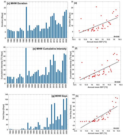 The longest MHW duration (Figure 6c) was detected in 1994 and lasted 26 days; however, this only represents one MHW in that year, as can be seen in the annual MHW frequency (Figure 5a). This could be related to the highest SST variability in 1994, as shown in the EOF analysis (Figure 4c,d). In addition, [2,26] found a warm peak in 1994 occurring in the second half of the year, confirming our results. Except for 1994, the temporal basin’s average MHW duration (Figure 6c) shows a general increase from roughly 6 days to >10 days in the last decade (2010–2020), with a maximum of ~24 days in 2020. The annual MHW duration shows a correlation (R) of 0.60 with the annual mean SST (Figure 6d). The annual average basin MHW cumulative intensity (Figure 6e) ranged from 8 °C days to 80 °C days. The greatest annual MHW cumulative intensity (78 °C days) was recorded in the same year (i.e., 1994) as the MHW duration. The annual average MHW cumulative intensity was approximately 44 °C days over the last decade (2010–2020) (Figure 6e), with the highest value in 2019.