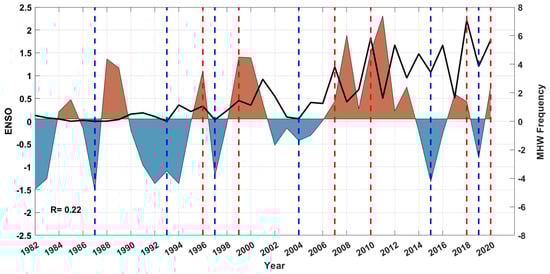The annual normalized time series of El Niño-Southern Oscillation (ENSO) (left y-axis) and total MHW frequency (events) (right y-axis) over the study period (1982–2020). The vertical dashed red lines indicate the positive phase of ENSO (El Niño), and the vertical dashed blue lines indicate the negative phase of ENSO (La Niña).