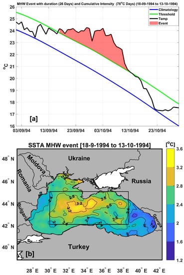 The longest MHW event was observed in the region from 42°N to 45.5°N and 30°E to 38°E and lasted for 26 days (from September 18 to October 13, 1994), with a cumulative intensity of 78 °C days, a maximum MHW intensity of 2.1 °C, and mean MHW intensity of 1.35 °C (Figure 8a,b). This event could be linked to the high SST variability reported in the EOF analysis (Figure 4c,d), which agrees with [2,26], whose authors discovered that the summer of 1994 was the longest, with quite high SST values (>20 °C) that were still observed during most of October.