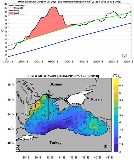 We found that the highest-intensity (~6 °C) MHW event occurred from 26 April 2018 to 12 May 2018 at longitude 29°E and latitude 46°N over sea areas near the Danube River runoff zone (Figure 9a,b). The mean intensity for this MHW event was 3.1 °C, with a cumulative intensity of about 51 °C days. This MHW event was associated with a positive SSTA pattern >2 °C across the entire Black Sea basin (Figure 9a).