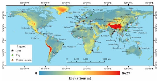 Map of the spatial distribution of the 48 most critical river deltas worldwide considered here [126]. The base map is a global map of lands surface elevation [taken from the GEBCO_2020 Grid [127]] with a spatial resolution of 15 arc s.