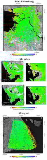 To show the potential of InSAR methodologies, we portray in Figure 2 some examples of ground displacement maps. Specifically, Figure 2 shows the mean ground displacement velocity maps of the Saint Petersburg (a), Shenzhen (b1,b2), and Shanghai (c) regions, respectively. As detailed in [240,260,261], the ground deformation in these coastal regions is mainly due to terrain subsidence linked to land reclamation projects.